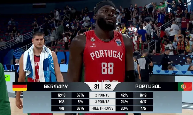 第二节比赛结束,德国31-32落后葡萄牙。