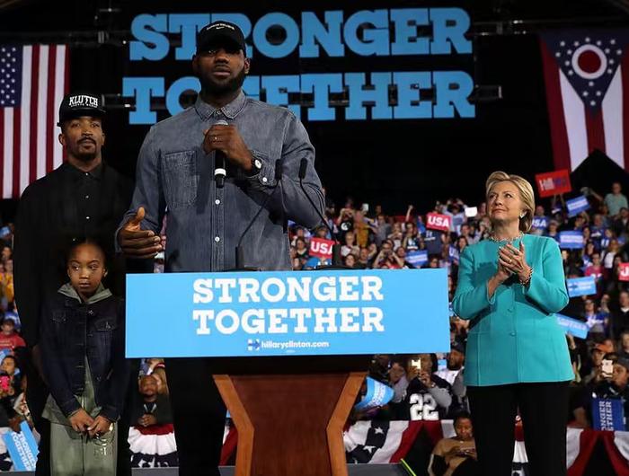 2016年詹姆斯在自己的主场俄亥俄疯狂给希拉里站台,从小作文到亲自上台演讲,那叫一个卖力。当时詹姆斯刚给克村拿到队史第一个总冠军,Buff叠满了对吧,有用吗?有用,完完全全的反作用,2016年大选希拉里在俄亥俄大败,输了8%,所有摇摆州里就数俄亥俄输的最惨。
